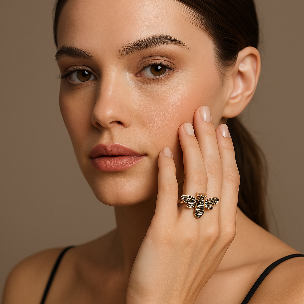 Anel banhado à ouro 18k, em formato de abelha e cravejados.