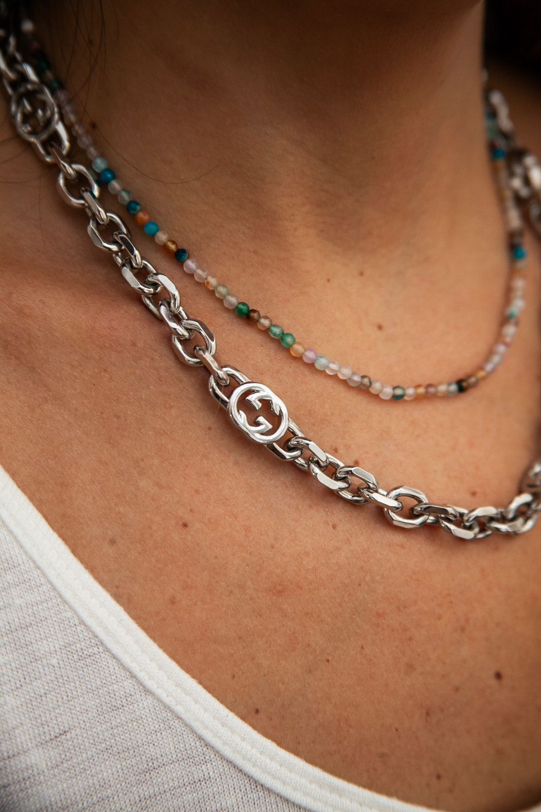 Colar Corrente inspirado nas icônicas coleções da famosa marca de luxo. Ele é confeccionado em metal bombado com acabamento em ródio, que confere um brilho excepcional e proteção contra a oxidação, garantindo durabilidade e resistência.
