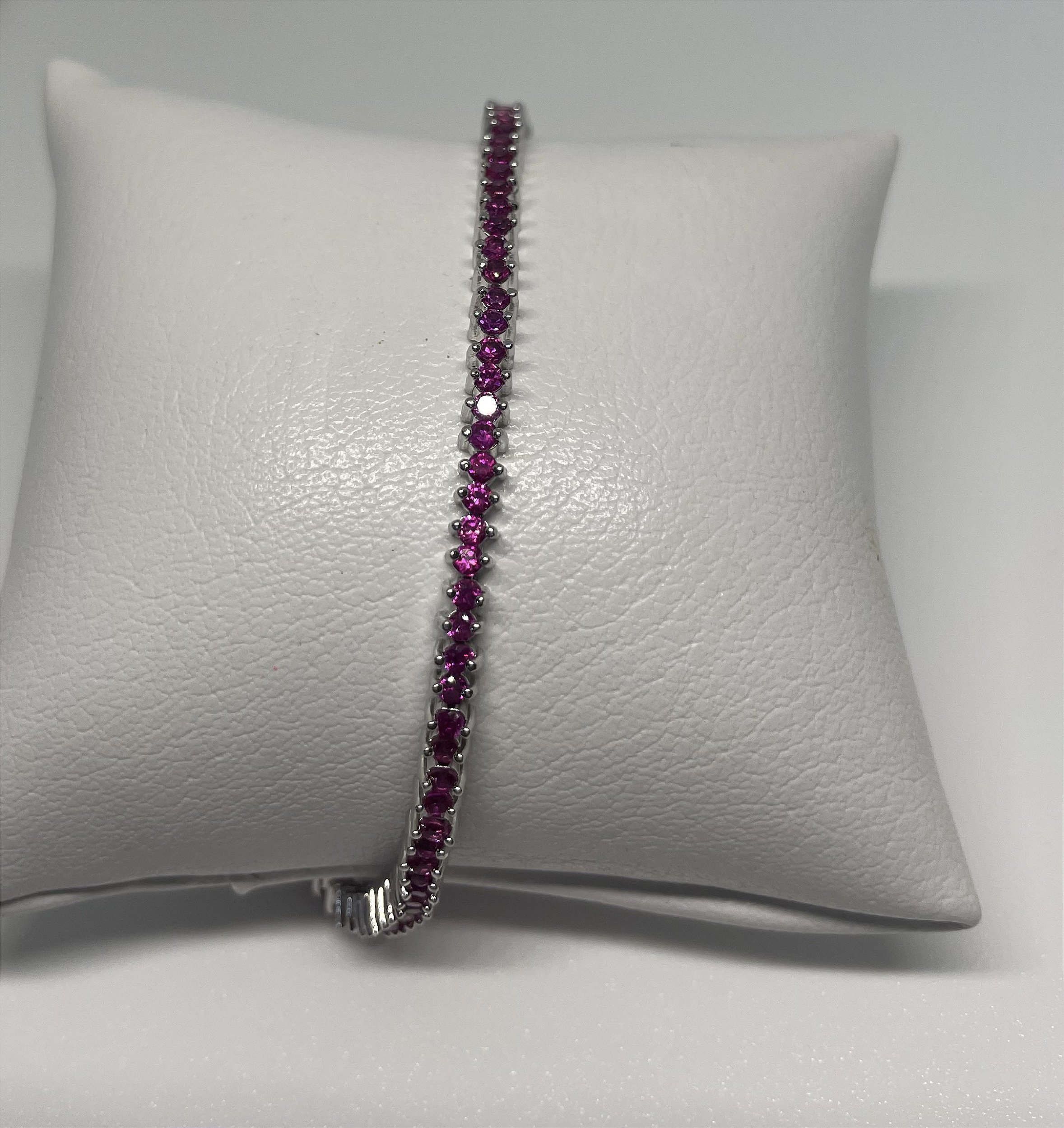 Pulseira riviera em banho de ródio, com cristal pink. Cravação 2 garras.